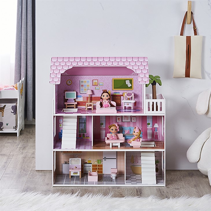 Rumah anak patung pelekat merah jambu kayu ini biasanya terdiri daripada beberapa bilik, termasuk bilik tidur, ruang tamu, dapur, bilik mandi dan sebagainya.